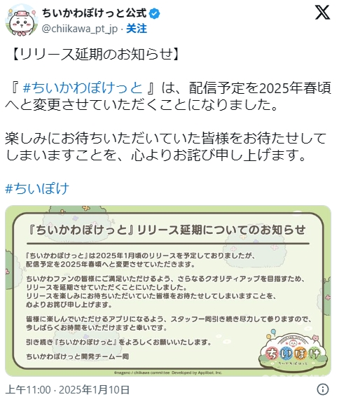 2025年1月10日,Applibot宣布“Chiikawa Pocket”的发布将推迟至2025年春季。
